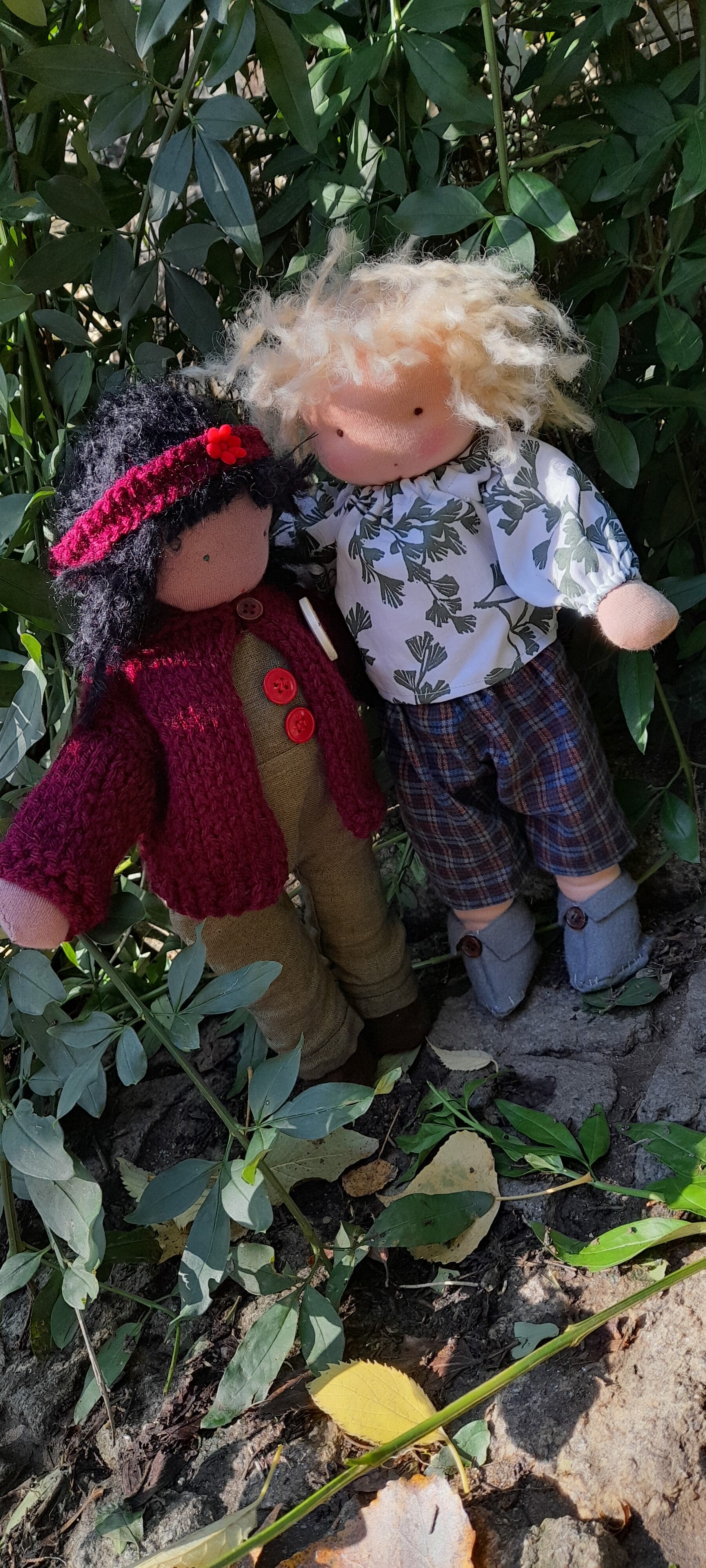 Boneco de inspiração Waldorf feito à mão com jersey de algodão orgânico, enchimento de lã (Merino, Galega, Bordaleira entre Douro e Minho, Churra Galega Bragançana). Cabelo em Mohair, toupas em algodão, lã, linho, feltro ou fazenda.