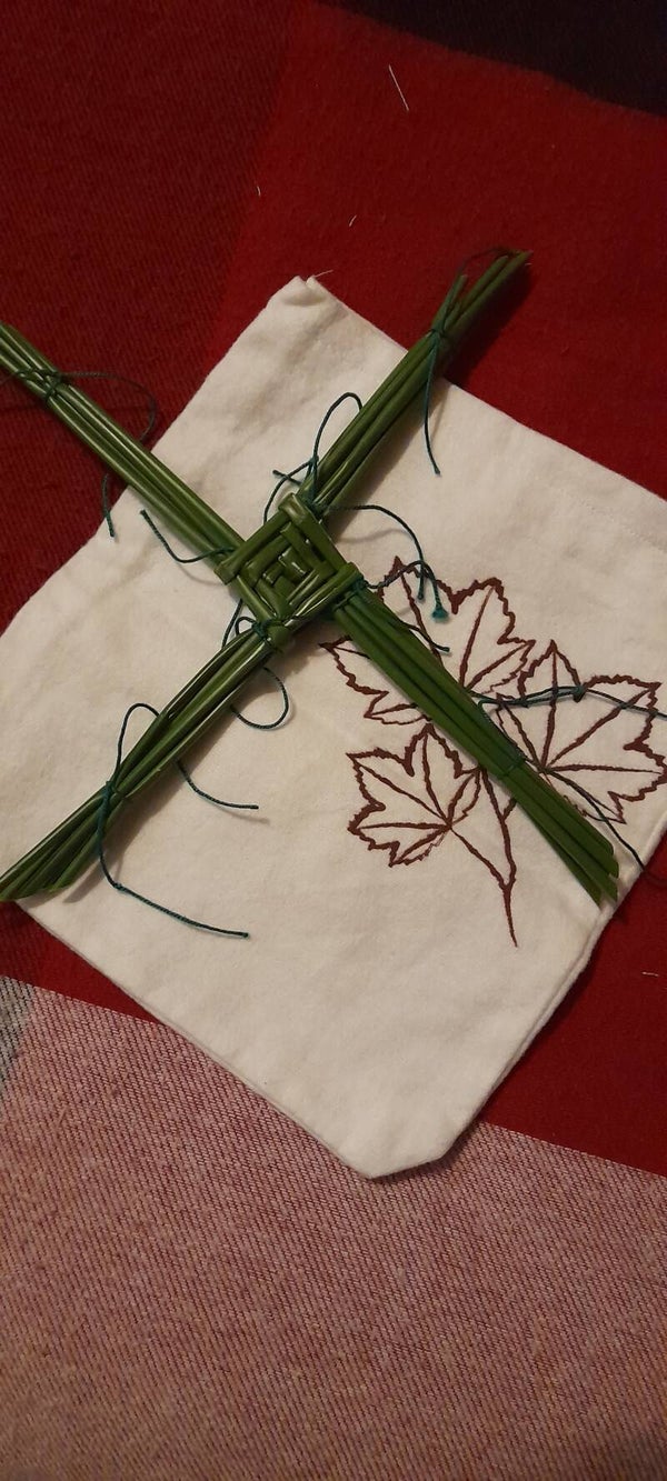 Cruz de Brighid de quatro ou três pontas. Feitas de junco verde colhido à beira rio. Com quatro ou mais voltas.